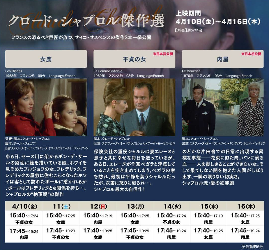 ヌーヴェル・ヴァーグの旗手として、サスペンスやミステリーの巨匠として、半世紀にわたってフランス映画界をけん引してきた映画監督、クロード・シャブロル。長編だけで54本の作品を遺したシャブロルとあって、我が国では未公開の隠れた傑作も多いが、人間存在への皮肉めいた眼差し、恐怖とユーモアの絶妙なバランス、モラルや常識をいとも簡単に飛び越えて描かれる、研ぎ澄まされた物語の数々は決して色あせることなく、先の見えない現在だからこそより一層輝く。2026年1月に東京日仏学院にて行われるレトロスペクティブ【クロード・シャブロル特集 女性形のサスペンス】に続き、その魅力をさらに深く堪能できる【クロード・シャブロル傑作選】が2月13日(金)より開催決定。上映される3本は長いキャリアの中でも黄金期と言って過言ではない、1960年代後半から70年に発表された、当時シャブロルの妻だったステファーヌ・オードラン主演によるサスペンスの極上作ばかり。しかも『不貞の女』『肉屋』は、特集上映を除き待望の日本初公開となる。2026年の幕開けにふさわしいシャブロルの官能的で濃密な映像世界にぜひ溺れてください。